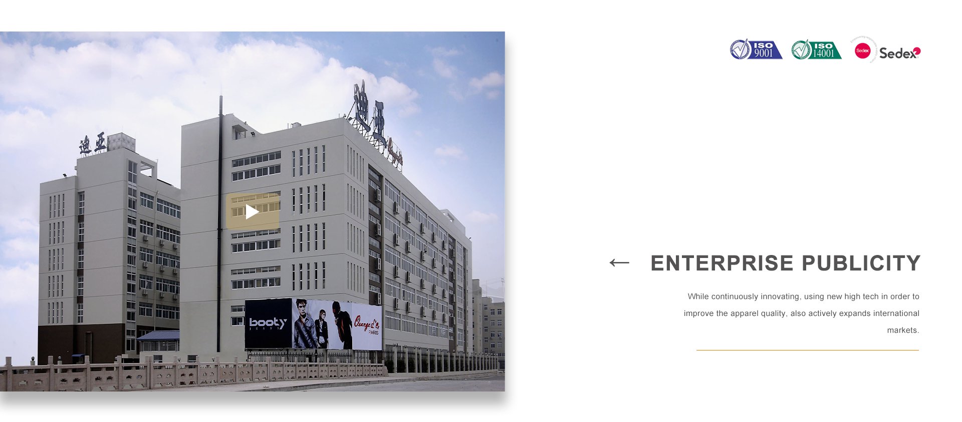 品牌建設(shè)是公司堅(jiān)持不懈的追求,我們每年都會(huì)積極參加國內(nèi)外舉辦的各大服裝展銷會(huì)。憑借著良好的質(zhì)量與信譽(yù),市場占有率在逐漸擴(kuò)大,產(chǎn)品遠(yuǎn)銷歐洲、美洲、亞洲等國。公司以生產(chǎn)棉衣、羽絨服、派克、大衣、夾克、運(yùn)動(dòng)休閑服飾等為主,旗下主打品牌有 ORANGE D’OR 和SASAEC,各品牌服飾均以典雅的色彩、優(yōu)美的線條、卓越的魅力吸引著都市麗人,將時(shí)尚、經(jīng)典的潮流信息予以淋漓盡致的演繹。